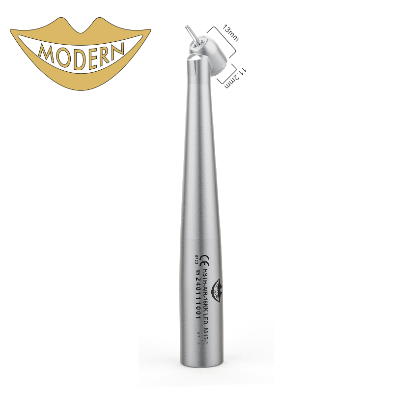 Die MODERN M45 ist eine kompakte Dental Turbine – kompatibel mit KAVO® Schnellkupplungen mit 4- oder 6-Loch-Anschluss mit Lichtfunktion. Sie verfügt über integrierte Glasfaser zur Lichtübertragung, ein robustes Gehäuse aus medizinischem Edelstahl, sowie einen abgewinkelten Turbinenkopf (45°) zur besseren Erreichbarkeit schwer zugänglicher Bereiche – insbesondere im Oberkiefer.