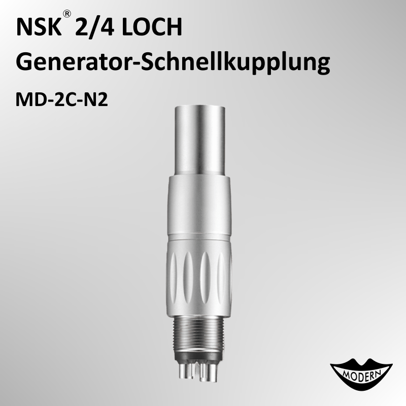 Die MODERN MD-2C-N2 ist eine präzise gefertigte Schnellkupplung zur Verbindung von NSK® kompatiblen Glasfaserturbinen mit zahnärztlichen Behandlungseinheiten. Sie ist für den 4-Loch-Anschluss mit Lichtausgang konzipiert und überträgt über ein integriertes Licht die Beleuchtung direkt an das Handstück.